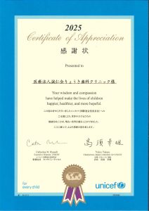 当院は長年ユニセフへの募金を続けており、2025年も日本ユニセフ協会より感謝状を頂きました。