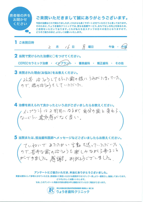 ていねいであたたかい言動を送って頂いたので、苦手な歯の治療も楽しみながら来ることができました。感謝。ありがとうございました。