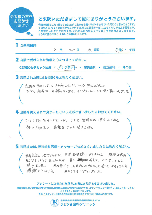 つけて頂いたインプラントがとても気持ちよく使えています。細い所まで希望をきいて頂きました。