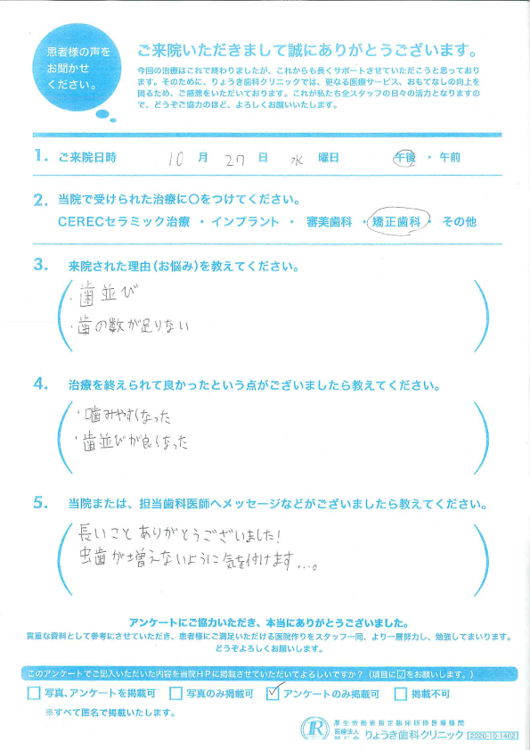 治療を終えられて良かったという点がございましたら教えて下さい:すごくきれいになって、人と話す時、笑顔を見せることに自信を持てるようになりました。
