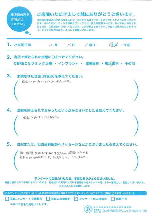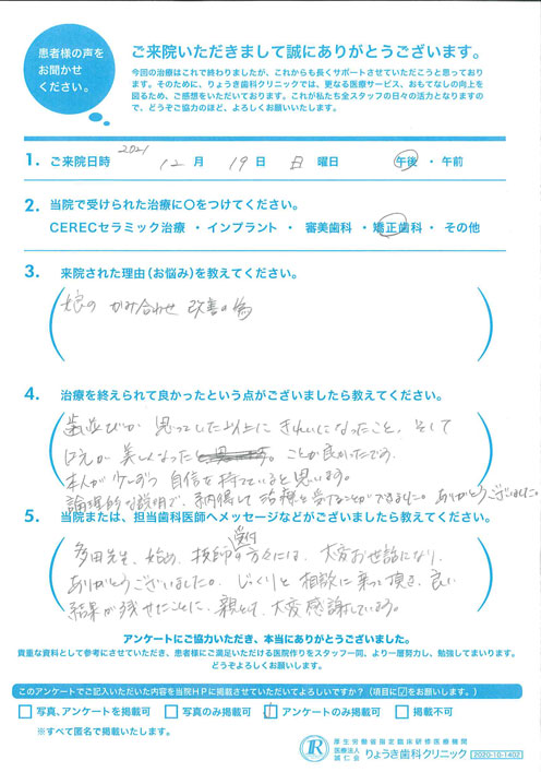 歯並びが思っていた以上にきれいになったこと、そして口元が美しくなったことが良かったです。本人が少しずつ自信を持てていると思います。論理的な説明で、納得して治療を受けることができました。ありがとうございました。